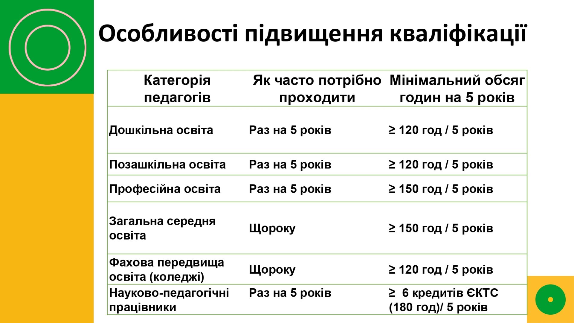 У законодавстві йдеться про те, що педагогічні працівники закладів дошкільної, позашкільної, професійної (професійно-технічної) освіти мають підвищувати свою кваліфікацію не рідше ніж один раз на 5 років. Окремо є пункт про те, що певні категорії освітян зобов’язані щороку підвищувати кваліфікацію. Тут уже йдеться про педагогічних і науково-педагогічних працівників закладів загальної середньої та фахової передвищої освіти.