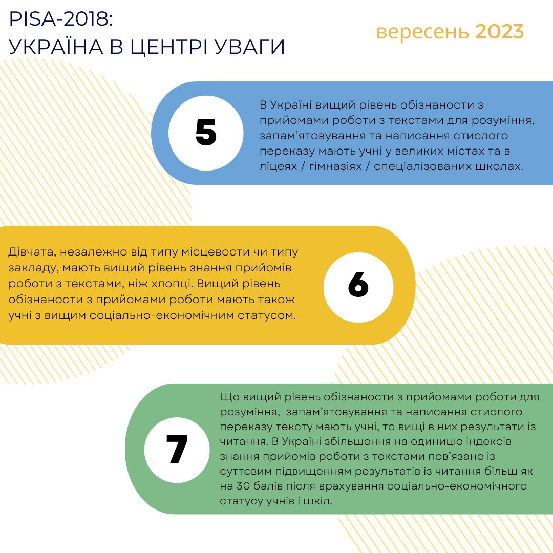 • В Україні вищий рівень обізнаности з прийомами роботи з текстами для розуміння, запам’ятовування та написання стислого переказу мають учні у великих містах та в ліцеях / гімназіях / спеціалізованих школах, а також дівчата та учні з вищим соціально-економічним статусом.
