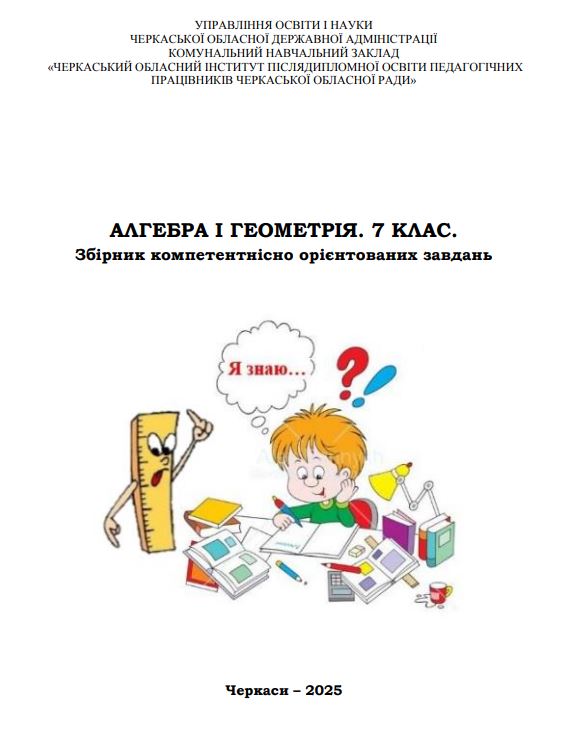 Алгебра і геометрія. 7 клас. Збірник компетентнісно орієнтованих завдань. / автор.-уклад. творча група учителів закладів ЗЗСО; за загальною редакцією О.М. Гриценко. Черкаси: КНЗ «ЧОІПОПП ЧОР», 2025. 84 с. |