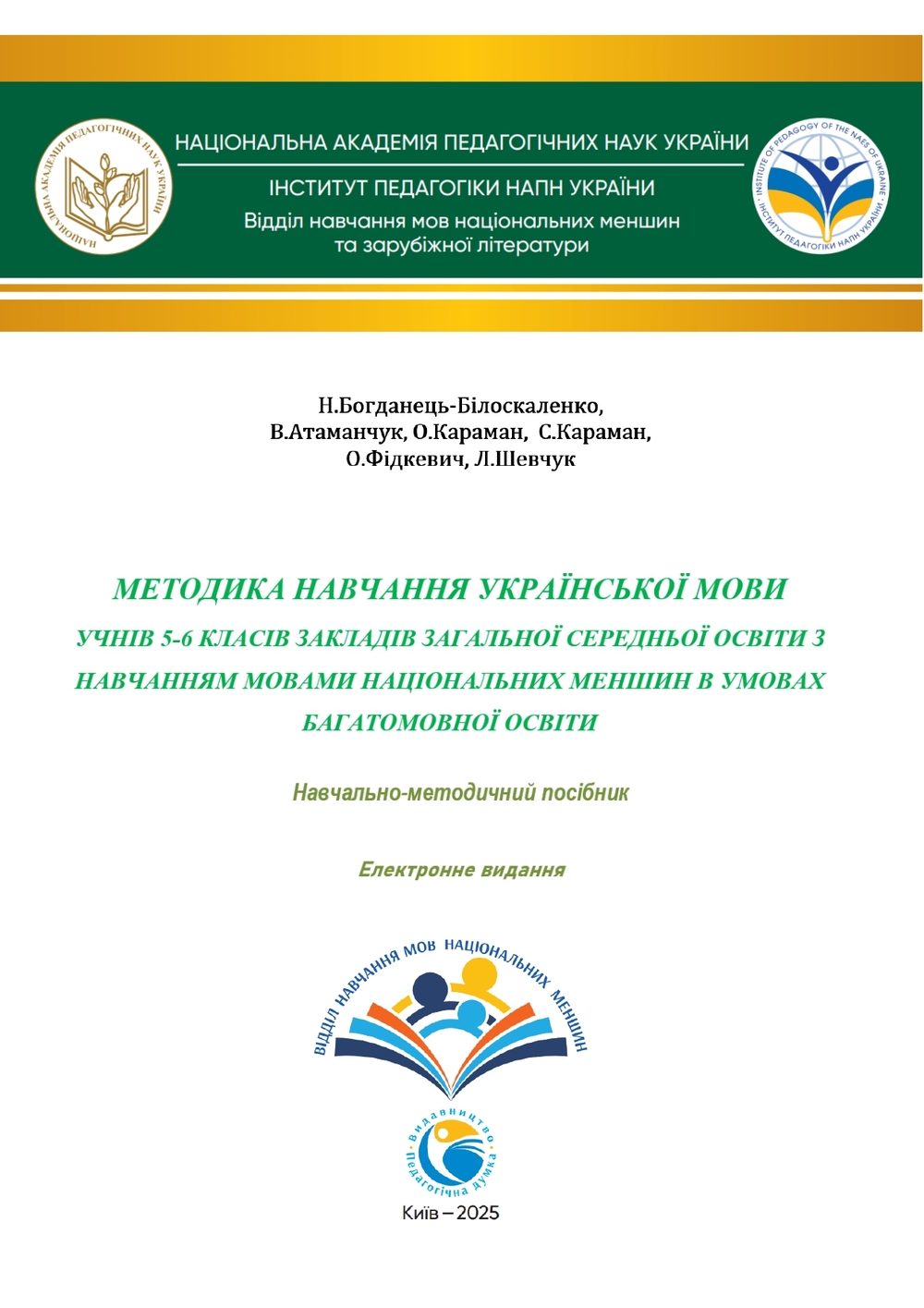 Методика навчання української мови учнів 5-6 класів закладів загальної середньої освіти з навчанням мовами національних меншин в умовах багатомовної освіти: навчально-методичний посібник / БогданецьБілоскаленко Н., Атаманчук В., Караман О., Караман С., Фідкевич О., Шевчук Л. / за ред. Н.Богданець-Білоскаленко. [Електронне видання]. Київ : Педагогічна думка, 2025. 168 c. |