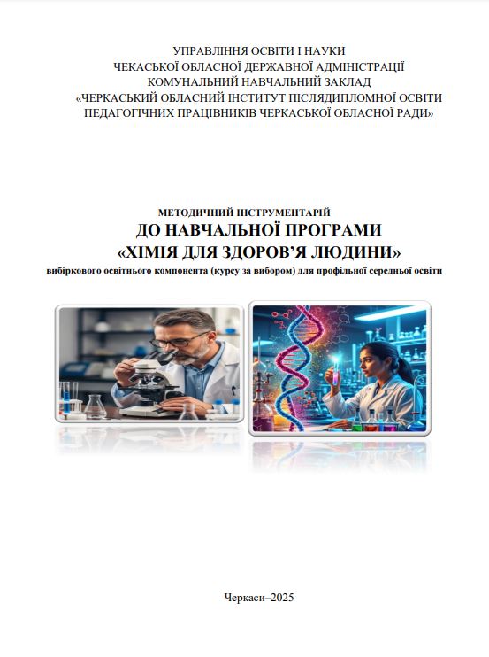 Методичний інструментарій до навчальної програми «Хімія для здоров’я людини» вибіркового освітнього компонента (курсу за вибором) для профільної середньої освіти: методичний посібник / автор. кол. у складі Северинової А.М. (гол.авт.кол.), Заруби Л.В., Кравець Н.У., Мигаленко Т.В., Савєнкова О.Є, Смирнова О.Ю.,Туренко А.Б. Черкаси: ЧОІПОПП ЧОР, 153с. |