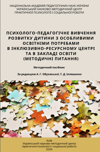 Психолого-педагогічне вивчення розвитку дитини з особливими освітніми потребами в інклюзивно-ресурсному центрі та в закладі освіти (методичні питання): методичний посібник / авт. кол. : Т. В. Жук, Т. Д. Ілляшенко, Т. Д. Каменщук, А. Г. Обухівська, Г. В. Якимчук; за ред. А. Г. Обухівської, Т. Д. Ілляшенко. Київ : Український науковометодичний центр практичної психології і соціальної роботи, 2024. 86 с | Завантажити | |
