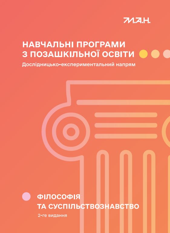 Навчальні програми з позашкільної освіти. Дослідницько-експериментальний напрям. Філософія та суспільствознавство / О. В. Боровець, Т. П. Заїка, Г. С. Зоря та ін. — 2-ге вид. — Київ : Національний центр «Мала академія наук України», 2025. 240 с. |