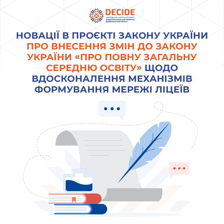 Ці та інші зміни пропонує зареєстрований у Верховній Раді України проєкт Закону про внесення змін до Закону України «Про повну загальну середню освіту» щодо вдосконалення механізмів формування мережі ліцеїв, у розробці якого взяли участь експерти проєкту DECIDE.