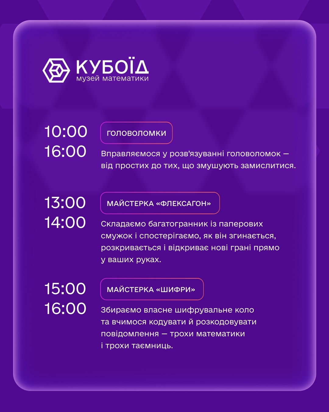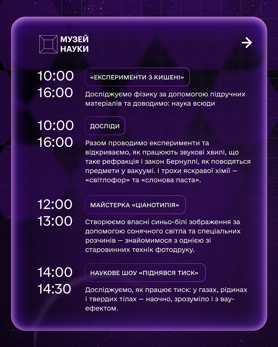 Зокрема — освітні активності від Музею науки та Музею математики, де ми досліджуватимемо звук і тиск, знайомитимемося з однією зі старовинних технік фотодруку та розв’язуватимемо головоломки.