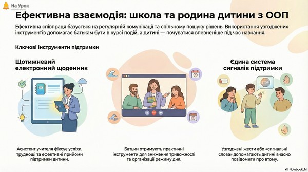 Наприклад, батьки можуть повідомити, у який час дитина краще концентрується, які види діяльності викликають у неї тривогу, а що, навпаки, заспокоює та мотивує. Якщо дитина вдома краще виконує завдання з використанням таймера або чіткої візуальної інструкції, ці ж підходи доцільно застосувати й під час уроків або корекційно-розвиткових занять. Важливим є й обмін успішними домашніми методами підтримки та мотивації. Батьки часто використовують прості, але дієві інструменти: невеликі символічні винагороди за виконане завдання, візуальні календарі або таблиці досягнень, спільне планування дня. Залучення таких практик у шкільному середовищі допомагає дитині відчувати послідовність вимог і підвищує її впевненість у власних можливостях.