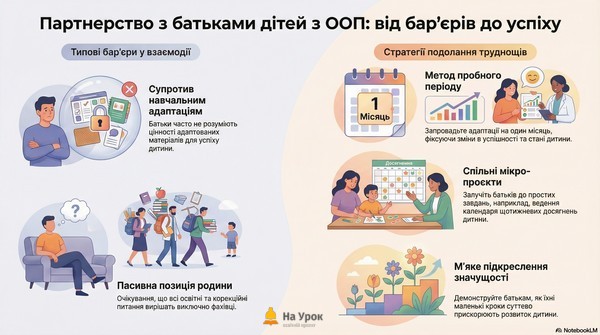У процесі взаємодії з батьками дітей з ООП Команда супроводу нерідко стикається з труднощами, що пов’язані з недостатнім розумінням особливостей освітнього процесу. У таких ситуаціях ефективним є поступовий підхід і демонстрація реальних, вимірюваних результатів. Наприклад, якщо батьки не погоджуються на використання адаптованих навчальних матеріалів, Команда супроводу може домовитись про пробний період тривалістю один місяць. Протягом цього часу фіксуються зміни в успішності, рівні залученості та емоційному стані дитини. Після його завершення батьки зазвичай бачать, що дитина впевненіше виконує завдання, менше втомлюється та демонструє позитивну динаміку, що допомагає прийняти новий формат навчання.