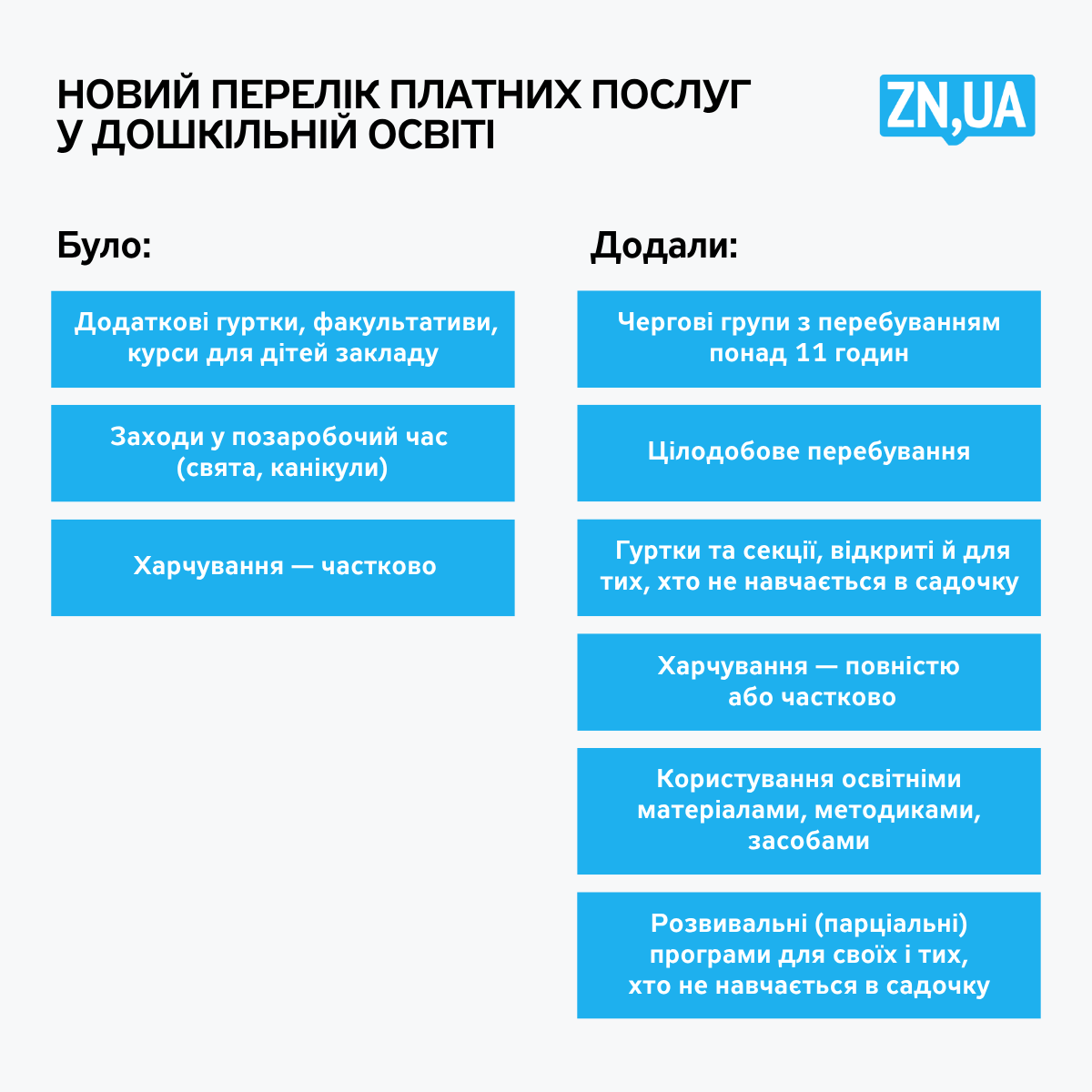 1. Платні послуги з базових програм. Як і в дитсадках, є загроза, що під виглядом додаткових послуг школи почнуть проводити за батьківські гроші заняття, які зобов’язані проводити безкоштовно. Серед них і платна підготовка до контрольних, відпрацювання пропусків, консультації, надолуження освітніх втрат або підготовка для НМТ.