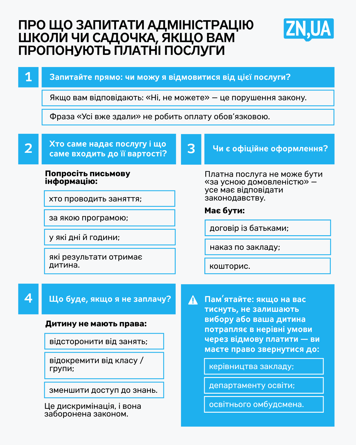 2. Прихований примус до оплати. Формально платні послуги є добровільними, але насправді батькам часто кажуть: усі вже здали гроші, і якщо ви відмовляєтеся, то вашу дитину під час занять просто посадять збоку.