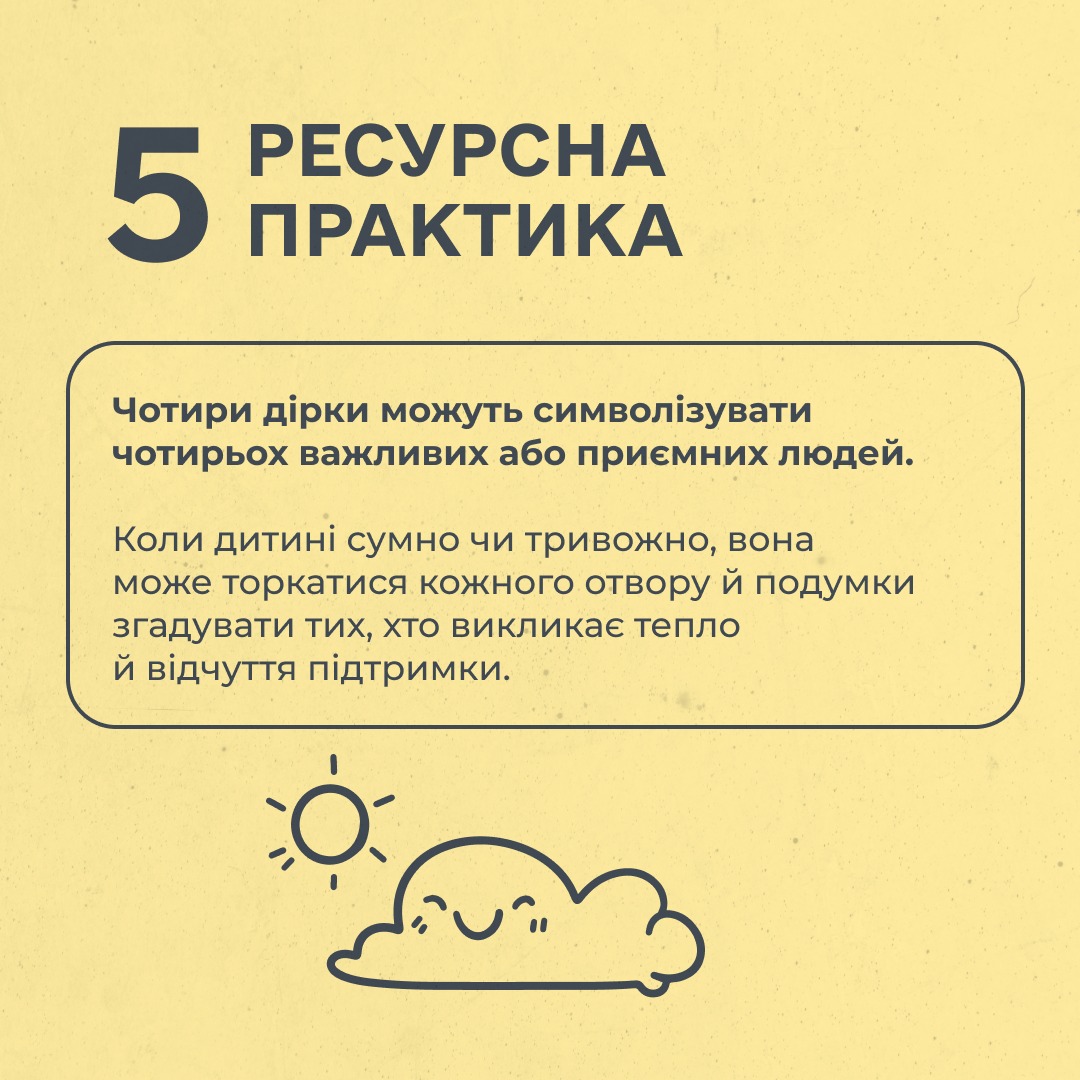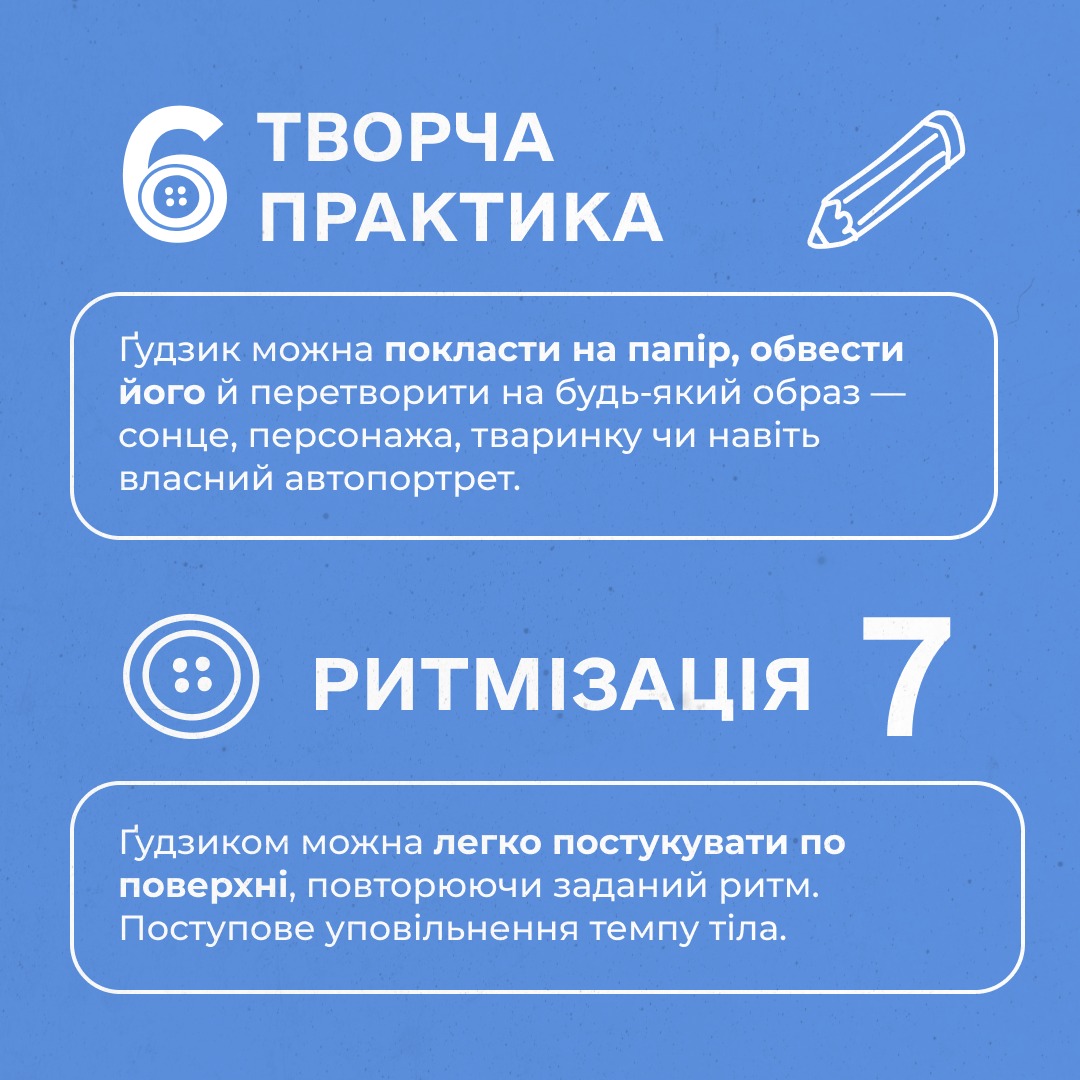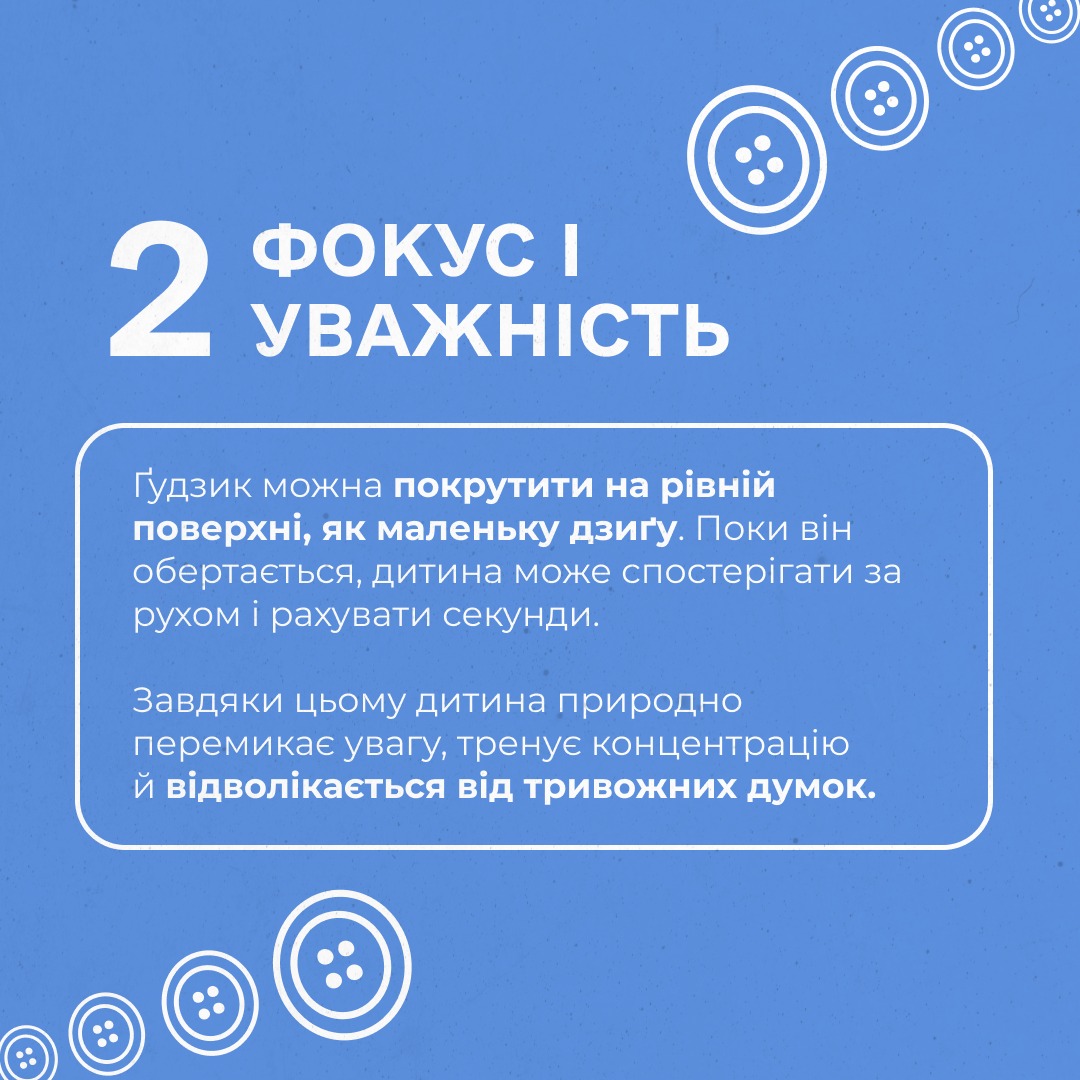 Через прості дії з ґудзиком дитина тренує увагу, повільне дихання та уяву, поступово вчиться краще відчувати своє тіло та емоції.
