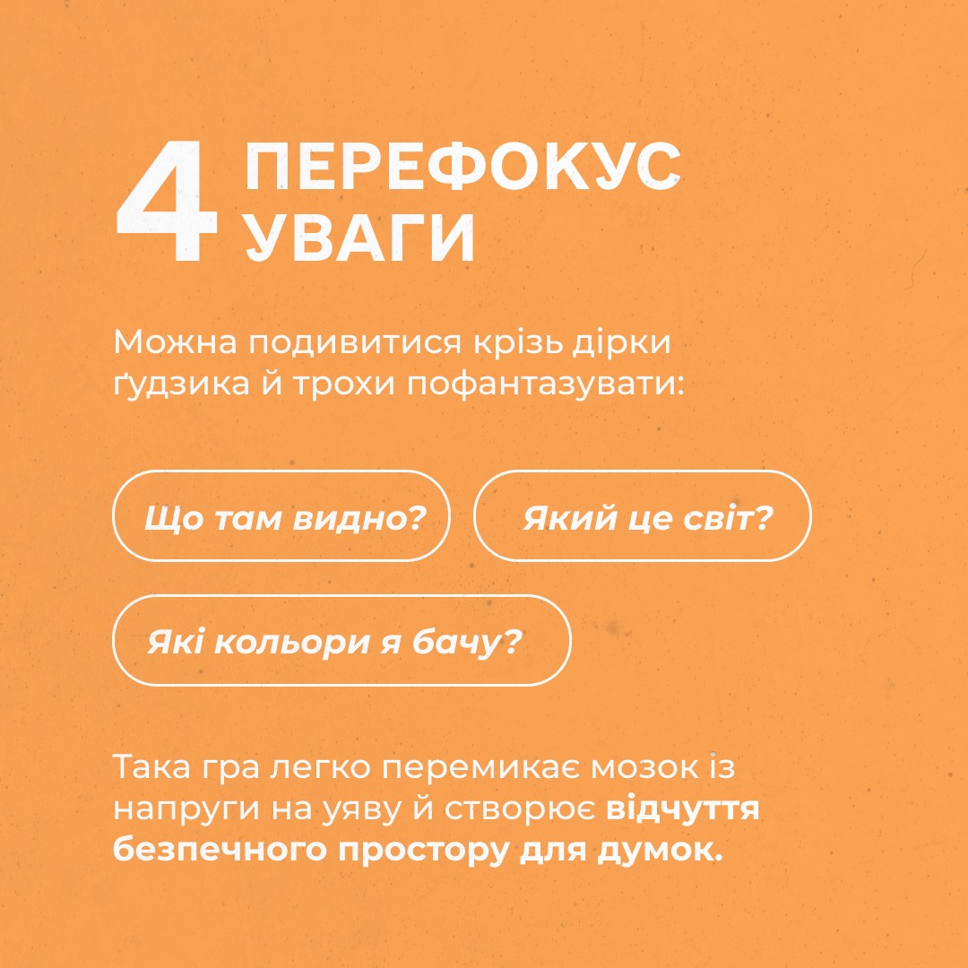 Спільно з психологинею Світлана Ройз ділимося ідеєю, яку вже випробували в багатьох дитсадках і школах. Ми ж радимо спробувати її і вдома — коли дитині потрібно сфокусуватися чи трохи «приземлитися».