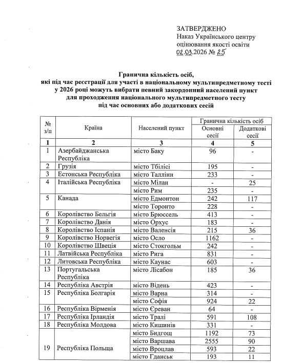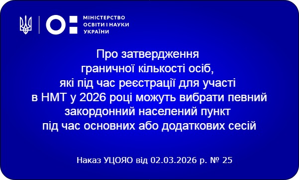 Наказом УЦОЯО від 02.03.2026 № 25 затверджена гранична кількість осіб, які під час реєстрації на НМТ можуть вибрати закордонний пункт для здачі тесту під час основних та додаткових сесій.