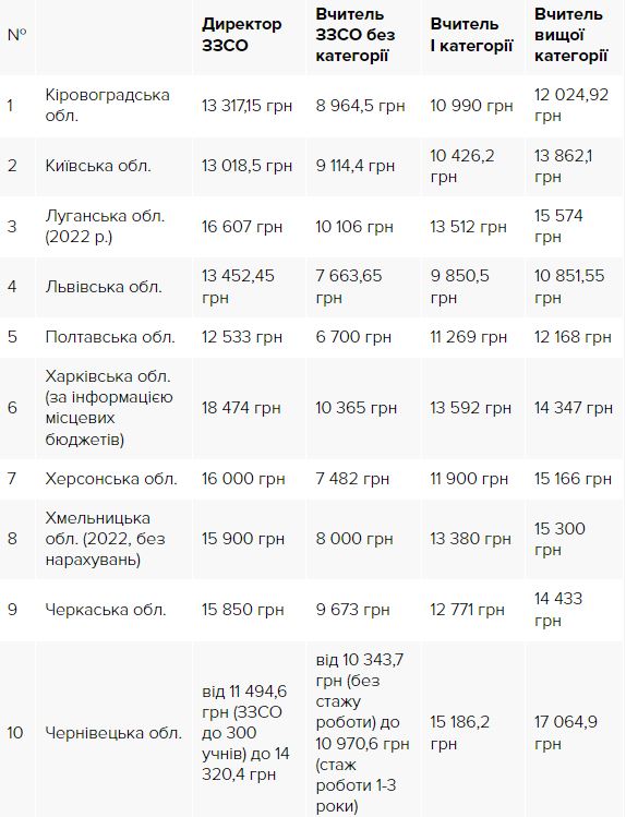 На запит щодо середньої заробітної плати директора ЗЗСО та вчителів ЗЗСО (без категорії, І категорії, вищої категорії) відповіли 19 областей.