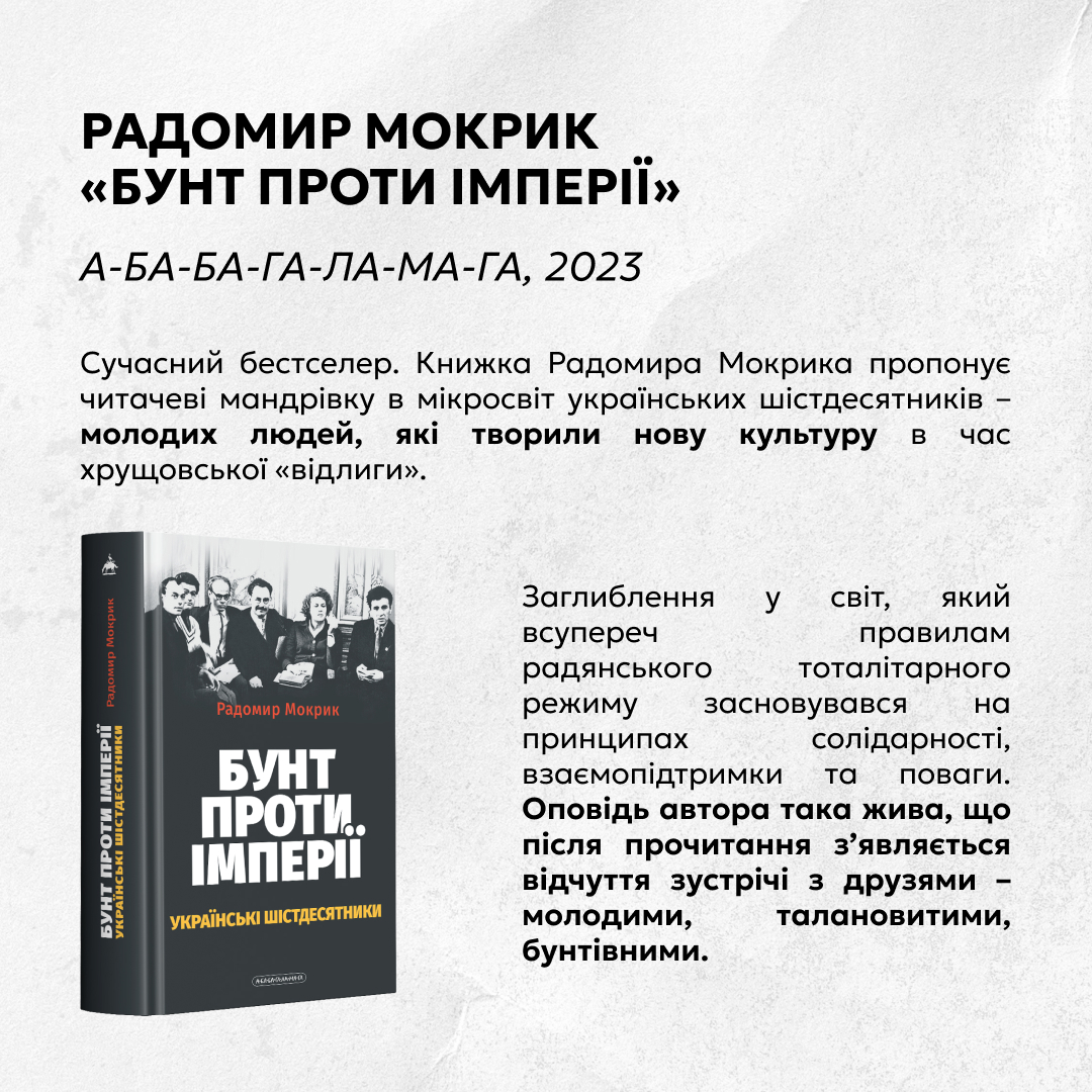 Команда Українського інституту книги спільно з Музей шістдесятництва / The Sixtiers Museum підготували для вас добірку книг, котрі допоможуть глибше осягнути феномен покоління шістдесятників.