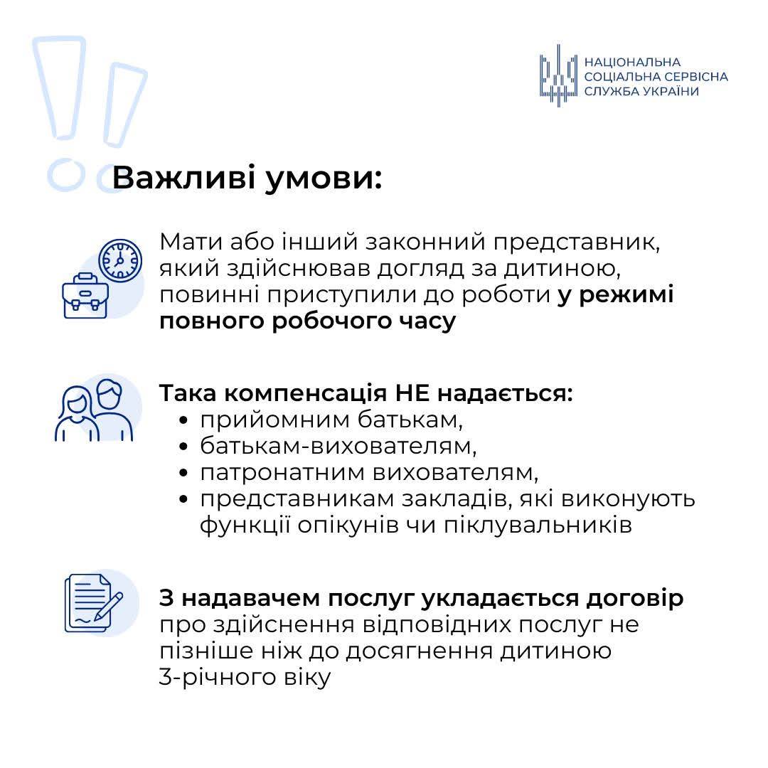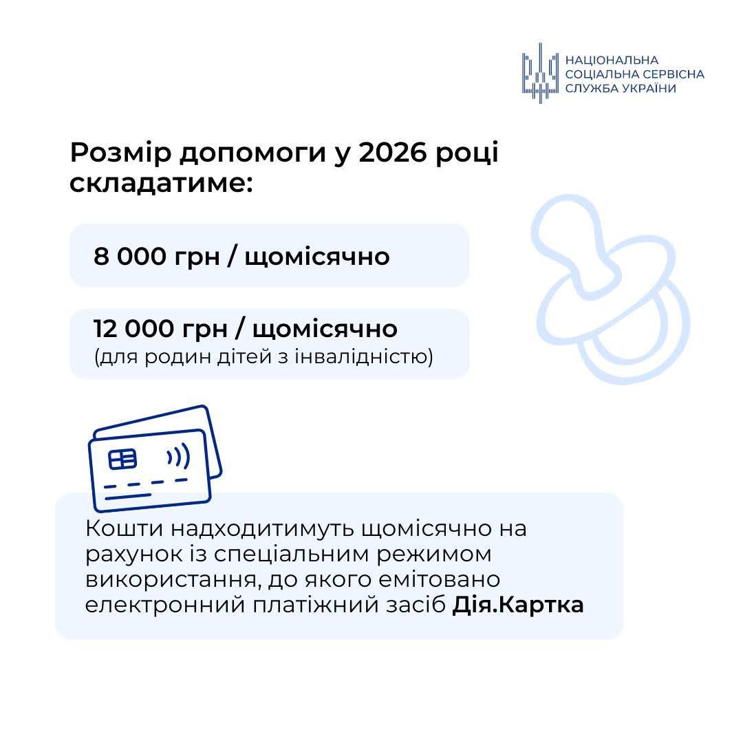 Нова допомога надається щомісячно матері або іншому законному представнику, які фактично доглядали за дитиною, зокрема дитиною з інвалідністю, та приступили до роботи у режимі повного робочого часу.