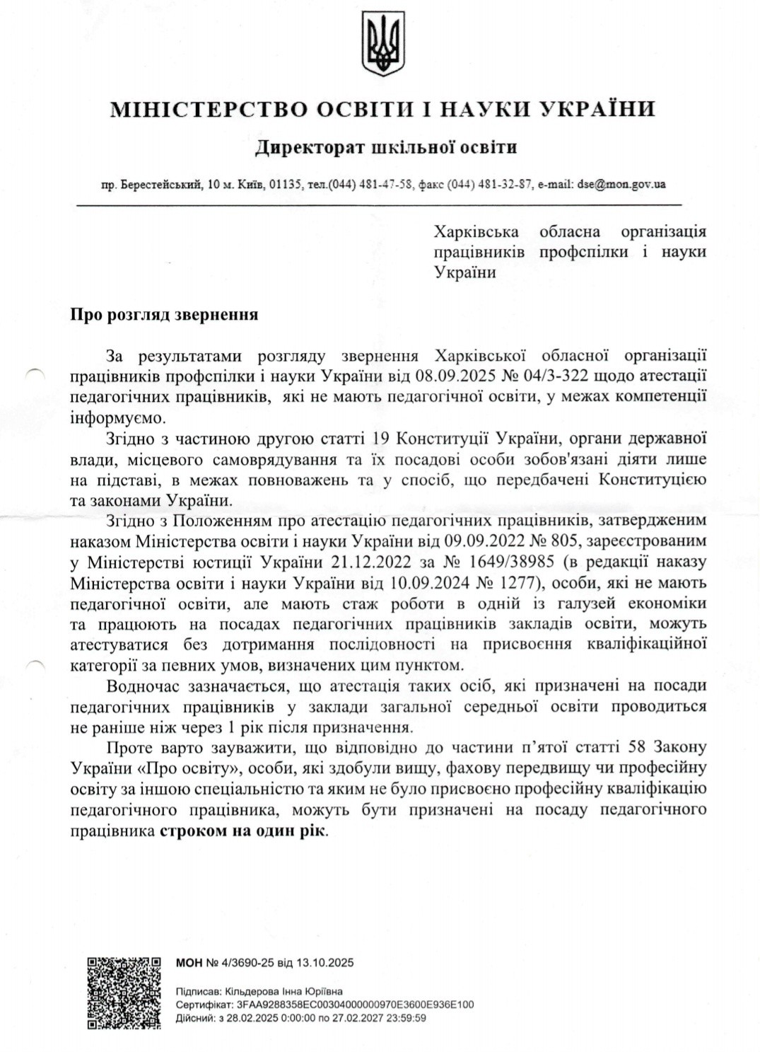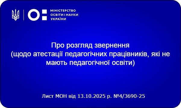 Лист МОН від 13.10.2025 р. №4/3690-25 "Про розгляд звернення" (щодо атестації педагогічних працівників, які не мають педагогічної освіти)