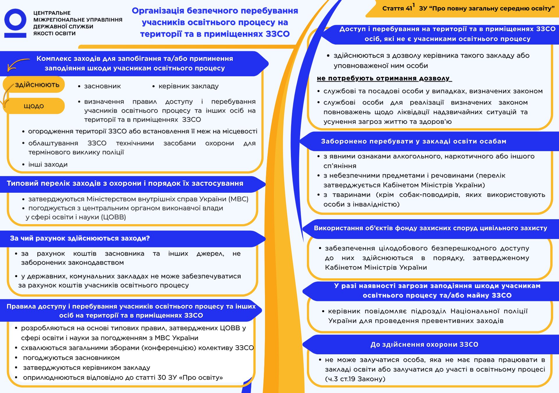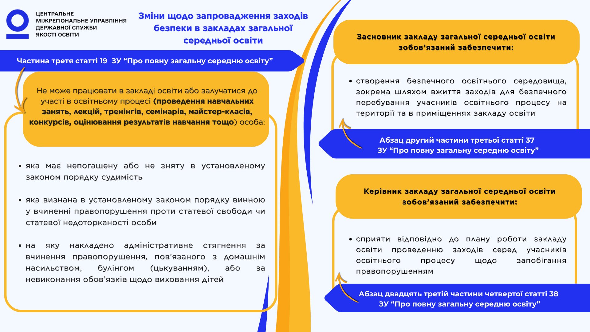 Верховною Радою України прийнято Закон України від 18.09.2025 № 4609-IX «Про внесення змін до Закону України “Про повну загальну середню освіту” щодо запровадження заходів безпеки в закладах загальної середньої освіти», який набрав чинності 17.01.2026.