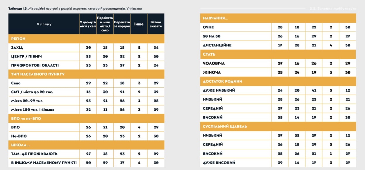 Більшість учнів (52%) хочуть залишитися в Україні після закінчення школи, із них 30% хотіли б і далі жити в рідному місті чи селі, а 22% хотіли б переїхати в інший населений пункт України. Водночас 22% вказали, що хотіли б переїхати за кордон, свідчать результати опитування "Війна, освіта та соціальний капітал. Три роки повномасштабного вторгнення".