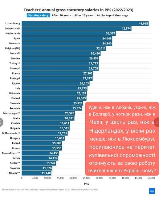 Удвічі, ніж в Албанії, утричі, ніж у Болгарії, у чотири рази, ніж у Чехії, у п'ять раз, ніж у Бельгії, у шість раз, ніж у Нідерландах, у сім раз, ніж у Швейцарії, і у вісім раз менше, ніж у Люксембурзі, посилаючись на паритет купівельної спроможності, отримують за свою роботу вчителі шкіл в Україні: чому?