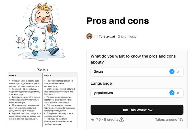 Спробуйте інструмент Pros and Cons (Переваги і недоліки) — він створює меми за вашим промптом. Просто введіть тему, зазначте, що текст має бути українською, і натисніть кнопку Run This Workflow. Можна генерувати кілька варіантів за одним промптом.