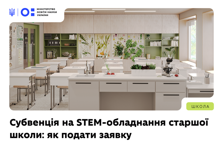 З 15 до 24 квітня 2026 року Міністерство освіти і науки України прийматиме заявки на отримання освітньої субвенції щодо створення сучасного освітнього простору. Її розмір становить 700 млн грн. Кошти спрямують на закупівлю техніки, мультимедійного обладнання та меблів для кабінетів біології, географії, математики, фізики, хімії та STEM-лабораторій у межах реформи старшої школи «Профільна».