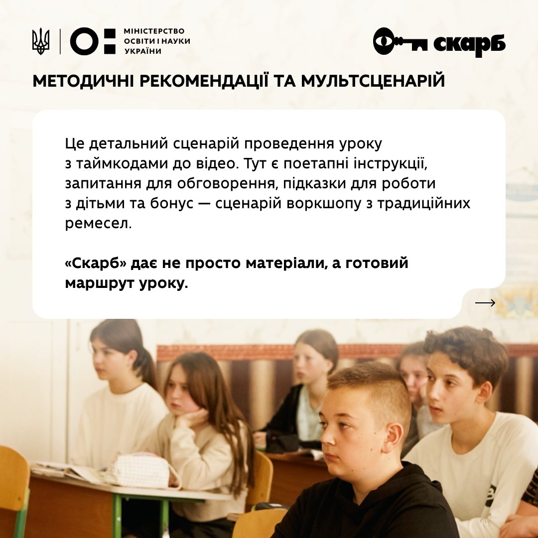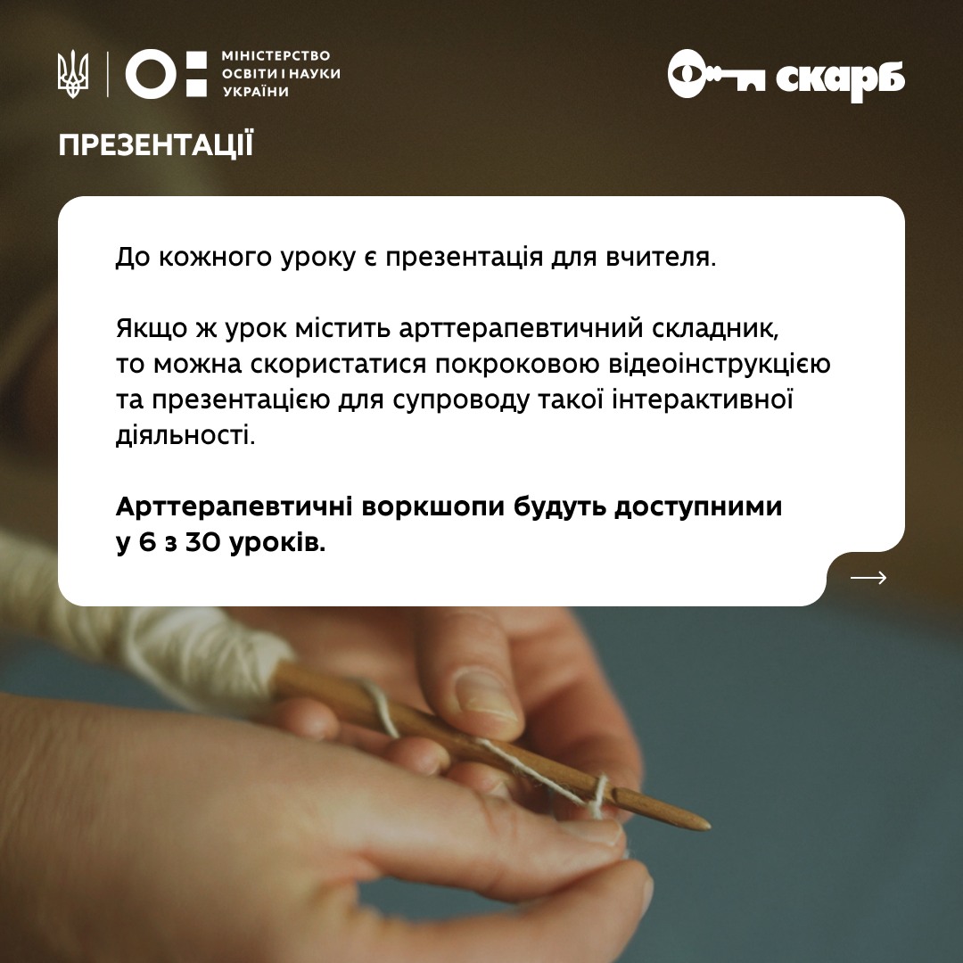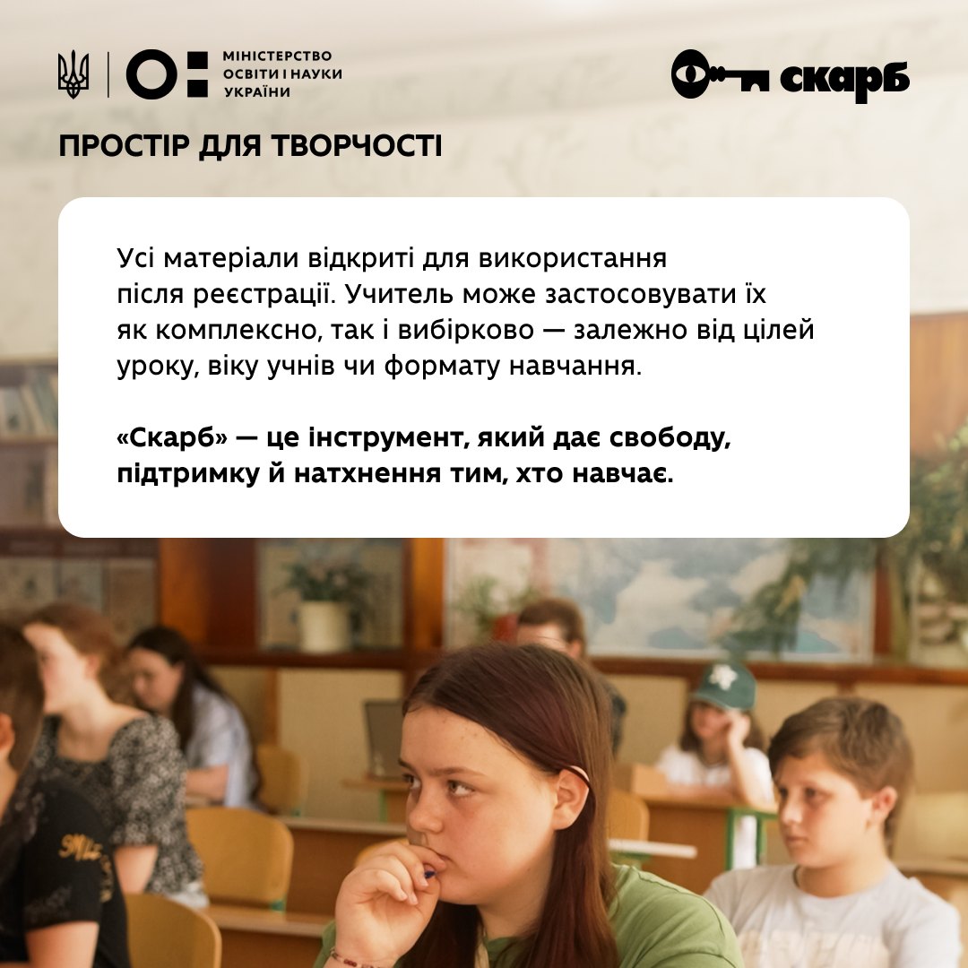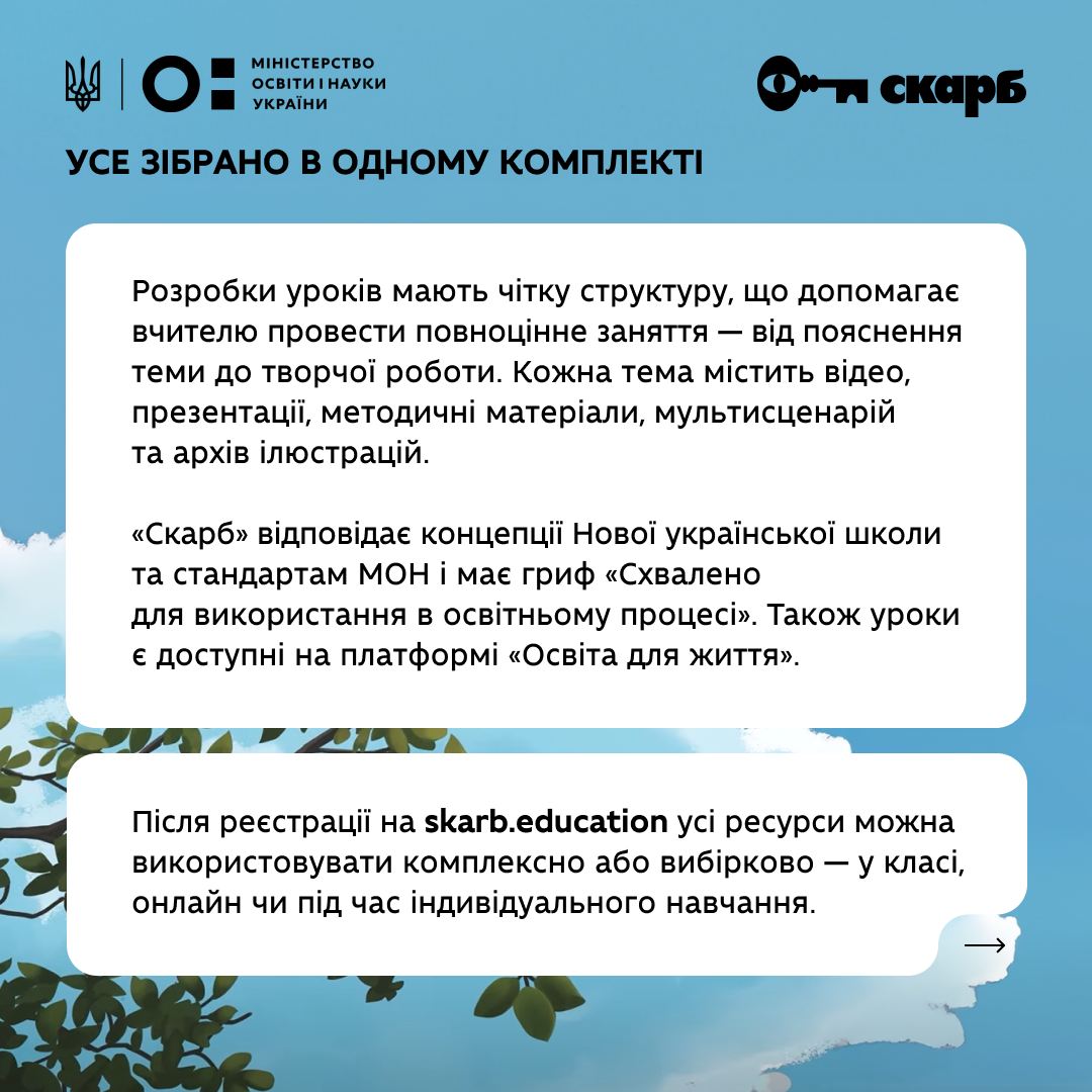 Після реєстрації на skarb.education учитель отримує доступ до всіх ресурсів і може будувати урок у будь-якому форматі — вибірково або комплексно, у класі, онлайн чи індивідуально.