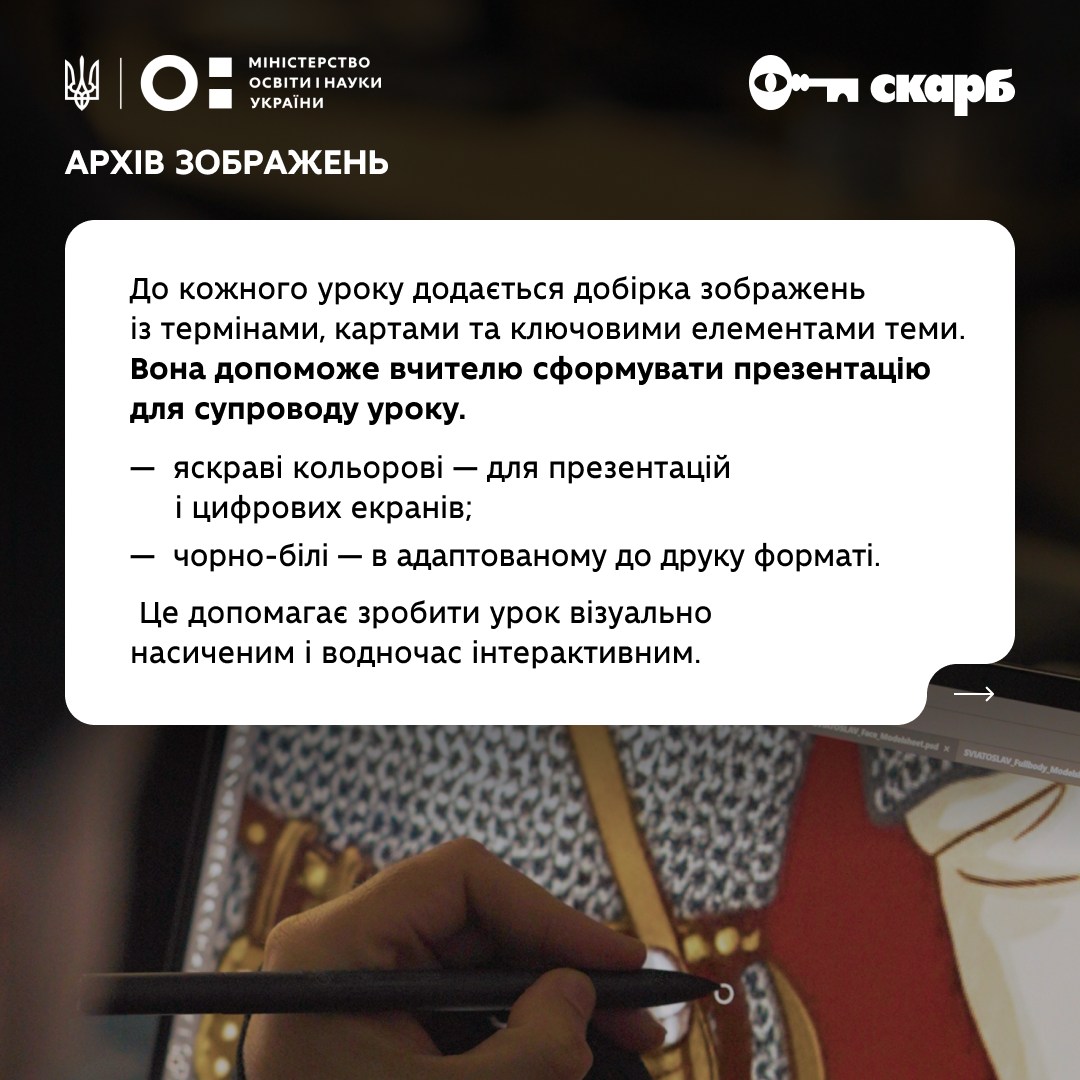 Структуровані матеріали, навчальні відео, презентації, методичні рекомендації, мультисценарій, архів ілюстрацій та творчі артворкшопи: усе згідно зі стандартами МОН і входить у комплекс із 30 уроків для 7 класу.