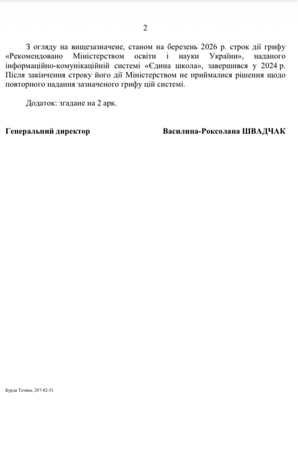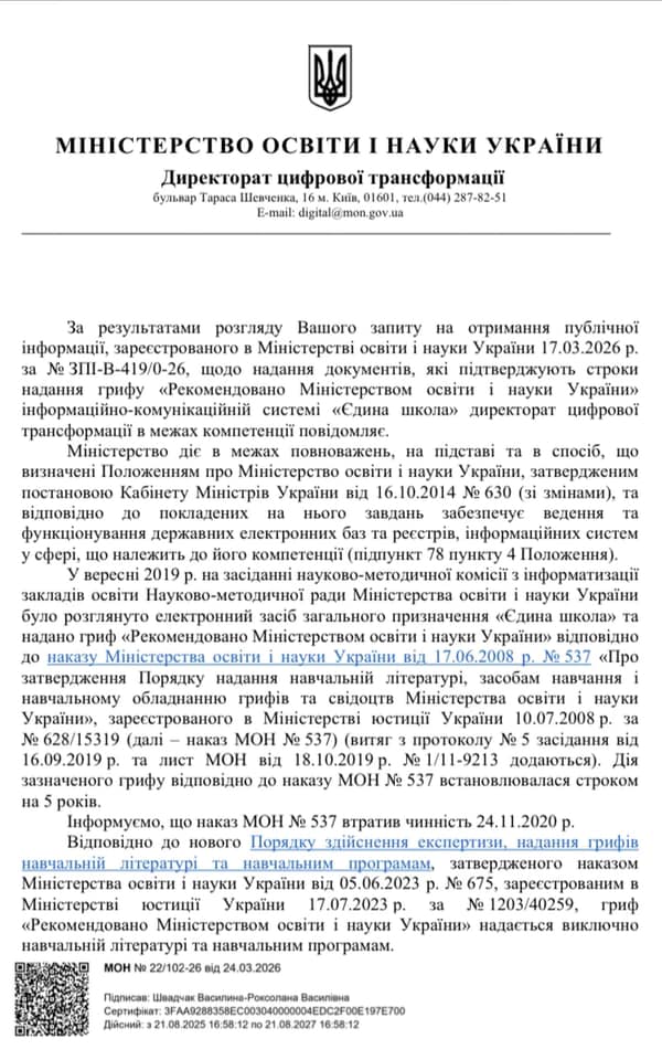 Це означає, що будь-яке подальше використання системою позначки «Рекомендовано МОН» є неактуальним та не має під собою чинних законних підстав. Питання щодо подальшого використання системи в закладах освіти без відповідної рекомендації міністерства залишається відкритим для адміністрацій шкіл та органів управління освітою.