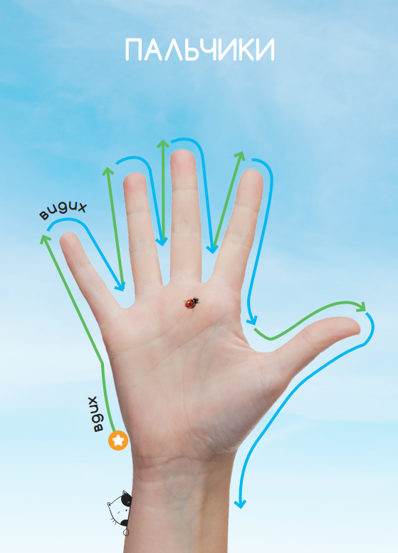Наприклад, дитина водить вказівним пальцем однієї руки по кожному пальцю іншої руки. Коли підіймається вгору – вдихає, а коли опускається з пальчика вниз – видихає (як на картинці нижче).