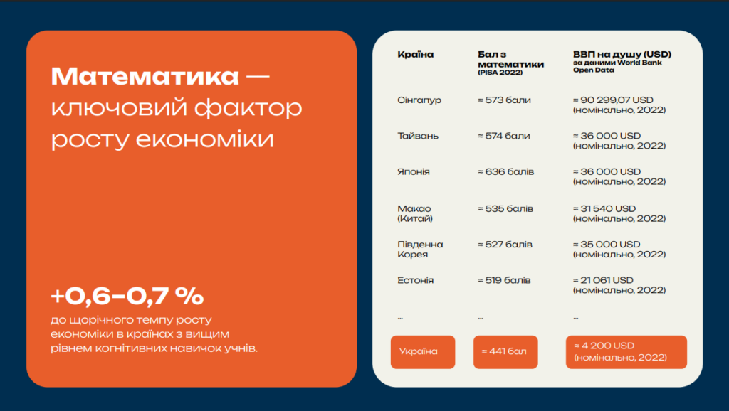 Дослідники наголошують: математичні навички безпосередньо пов’язані з економічним розвитком держави. У країнах із вищими когнітивними результатами учнів щорічне економічне зростання може бути на 0,6–0,7% вищим.