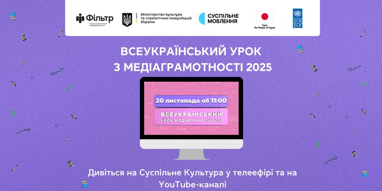 20 листопада об 11:00 Національний проєкт з медіаграмотності «Фільтр» Міністерства культури України та Суспільне Мовлення проведуть Всеукраїнський урок медіаграмотності 2025. Цьогоріч дата має особливе значення: саме 20 листопада Україна вперше відзначатиме День захисту дітей разом з усім світом — у Всесвітній день дитини.