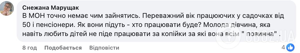 "В МОН точно немає чим зайнятись. Переважний вік працюючих у садочках від 50 і пенсіонери. Як вони підуть, хто працювати буде? Молода дівчина, яка навіть любить дітей не піде працювати за копійки за які вона всім "повинна".