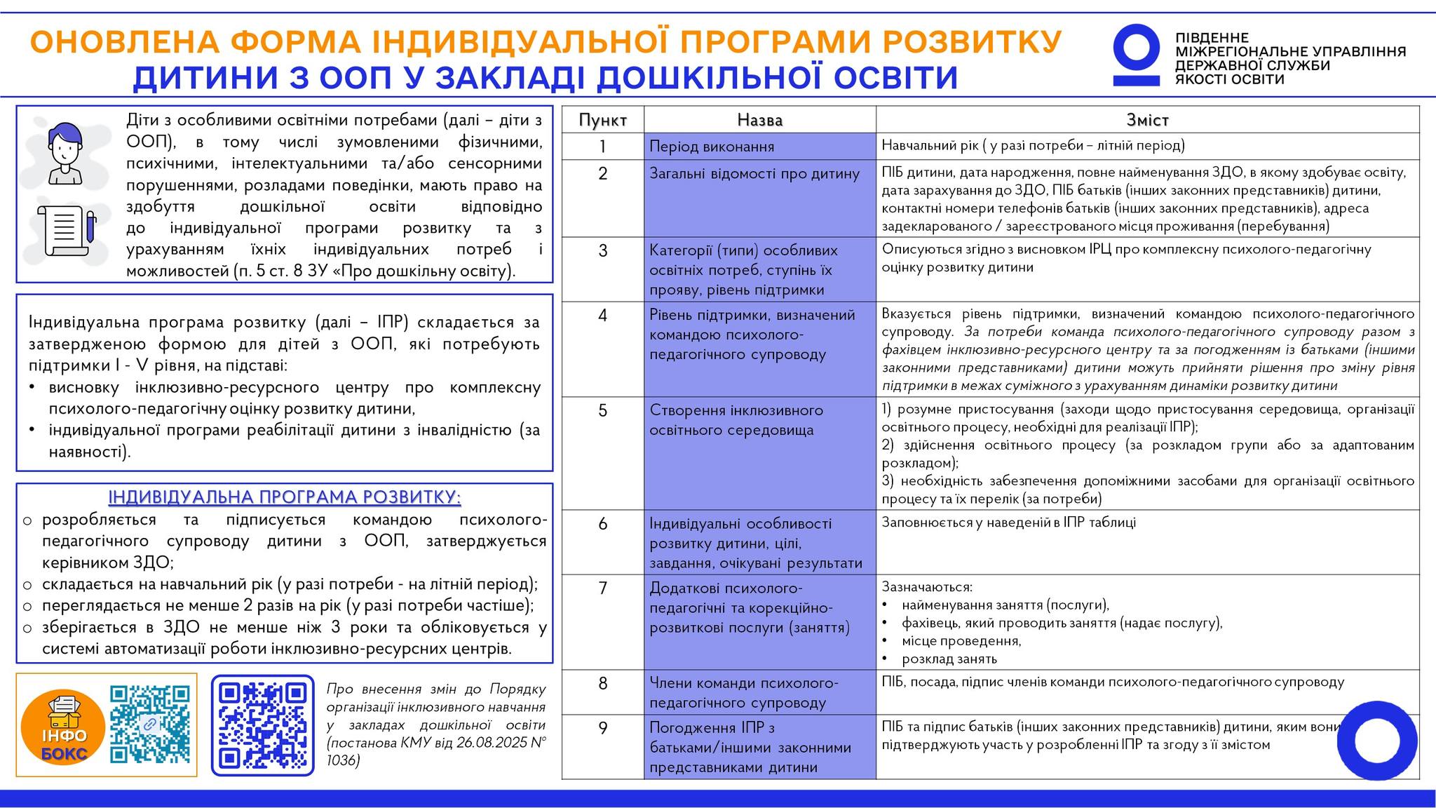 Команда Південного міжрегіонального управління Державної служби якості освіти підготувала та пропонує освітянам ознайомитися з наочним матеріалом щодо оновленого змісту ІПР у дитсадочках 👇🏻