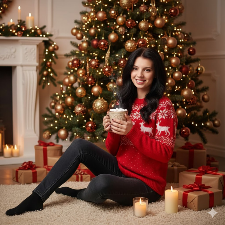 На ній яскравий червоний в’язаний светр з новорічним орнаментом (олені, сніжинки або ялинки), темні джинси або спідниця. У руках — чашка какао з маршмелоу або маленький подарунок.