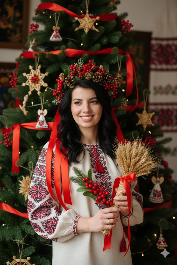 Освітлення: тепле, природне, підкреслює білизну вишиванки та червоні акценти. Атмосфера: українське Різдво, традиція, красa. Формат: 4:5, ультрареалізм.