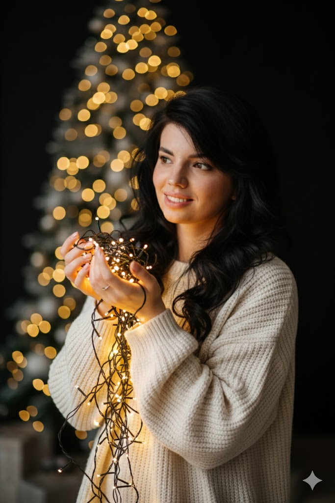 Освітлення: від гірлянди, м’яке, золотисте, магічне, створює ефект казки. Атмосфера: проста краса, магія світла, новорічне диво. Формат: 4:5, ультрареалізм.