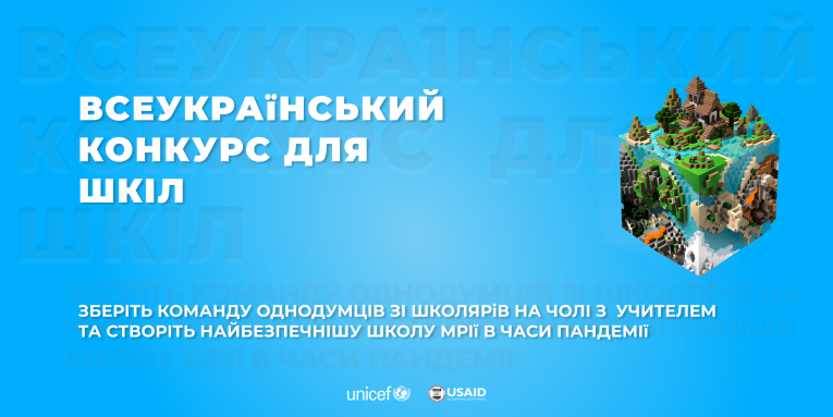 ЮНІСЕФ Україна запускає всеукраїнський конкурс для шкіл, який дозволяє дітям переосмислити нинішні реалії навчального процесу та реалізувати найбезпечнішу віртуальну школу мрії в часи пандемії. Конкурс проходитиме на навчальній платформі Minecraft: Education Edition. Основні умови — створена школа має бути максимально безпечною, відповідати умовам превенції поширення вірусу, рішення в проєкті мають бути реалістичними.