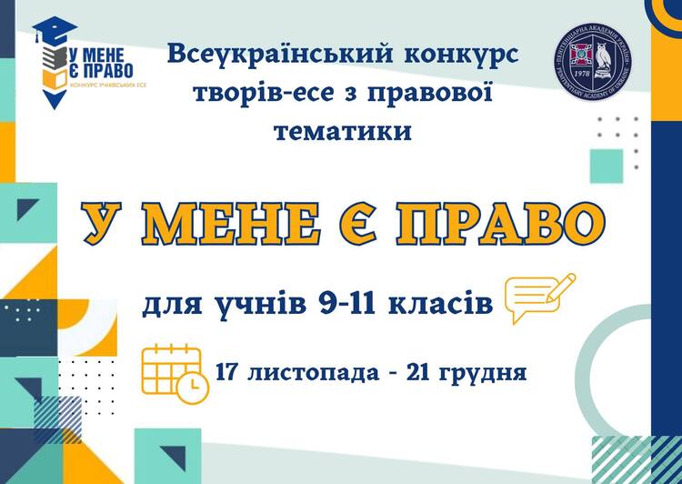 Пенітенціарна академія України оголошує щорічний Всеукраїнський конкурс творів-есе з правової тематики «У мене є право» серед учнів 9–11 класів закладів загальної середньої освіти України!