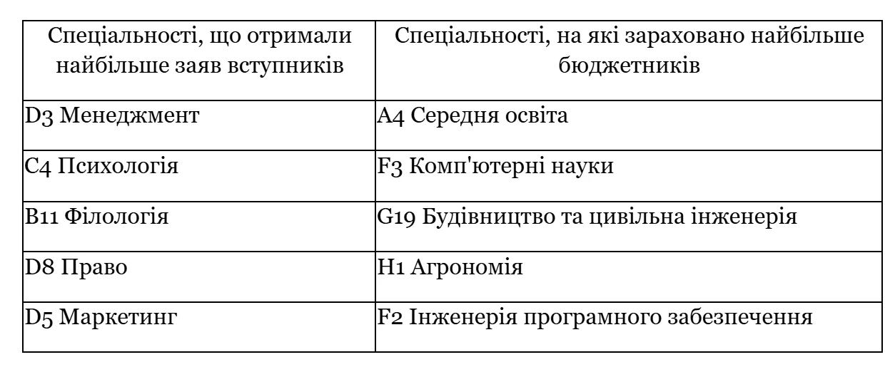 Професійні уподобання вступників залишаються стабільними: найпопулярнішими є економіка, право, психологія та маркетинг. Водночас держава через інструмент держзамовлення концентрує бюджет там, де брак кадрів уже стримує відновлення, а бізнес сигналізує про дефіцит фахівців: це освіта, інженерія, IT та наукомісткі галузі.