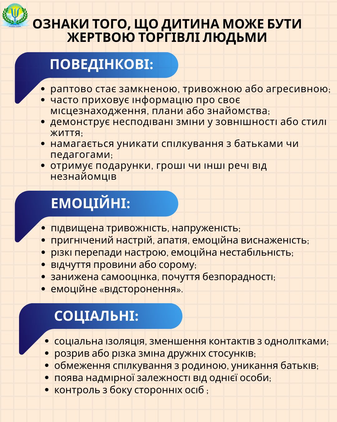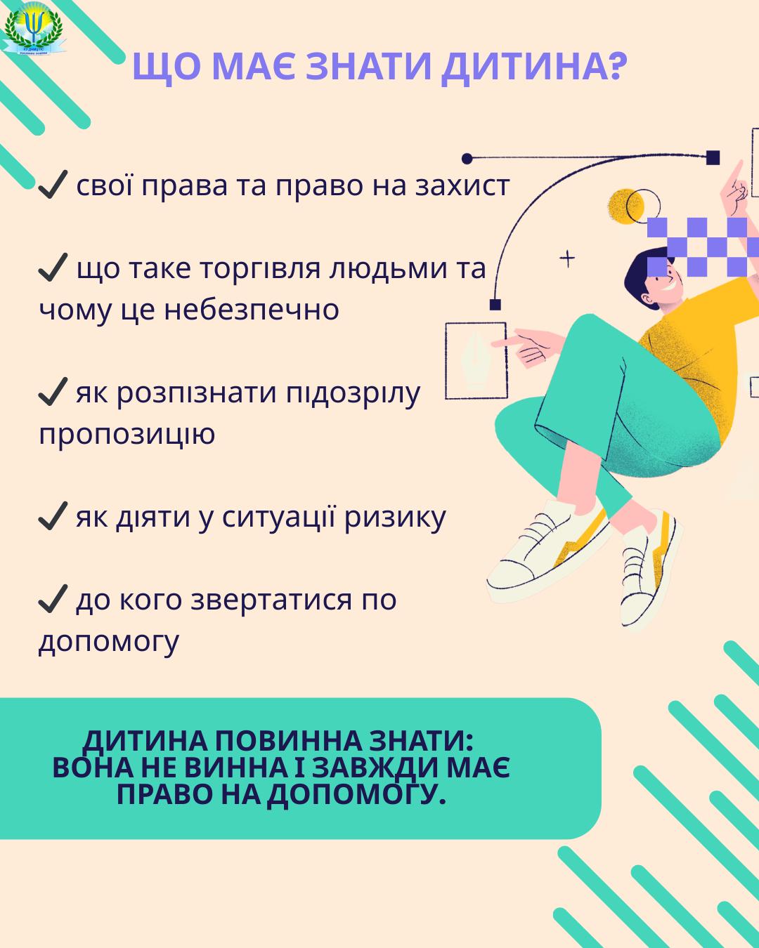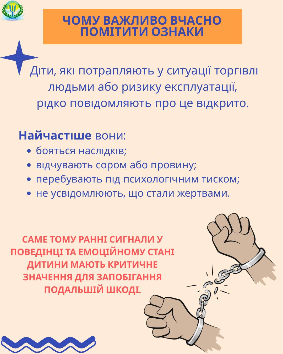 ⚠️ Торгівля людьми — це грубе порушення прав дитини та одна з форм сучасного рабства. Діти та підлітки через вік, недостатній життєвий досвід, довірливість, емоційну вразливість або складні життєві обставини можуть легко стати об’єктом маніпуляцій.