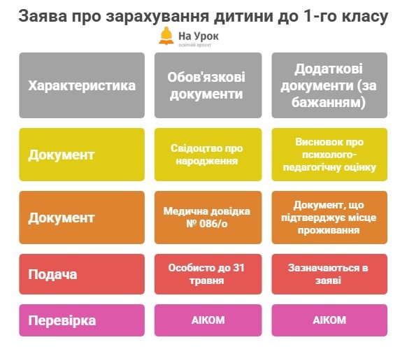 Заява про зарахування дитини до 1-го класу закладу освіти, за яким закріплена територія обслуговування, на якій проживає (перебуває) ця дитина, подається одним із батьків дитини особисто до 31 травня. У заяві обов'язково зазначаються реквізити (відомості про серію, номер (за наявності) та дату видачі) таких документів: