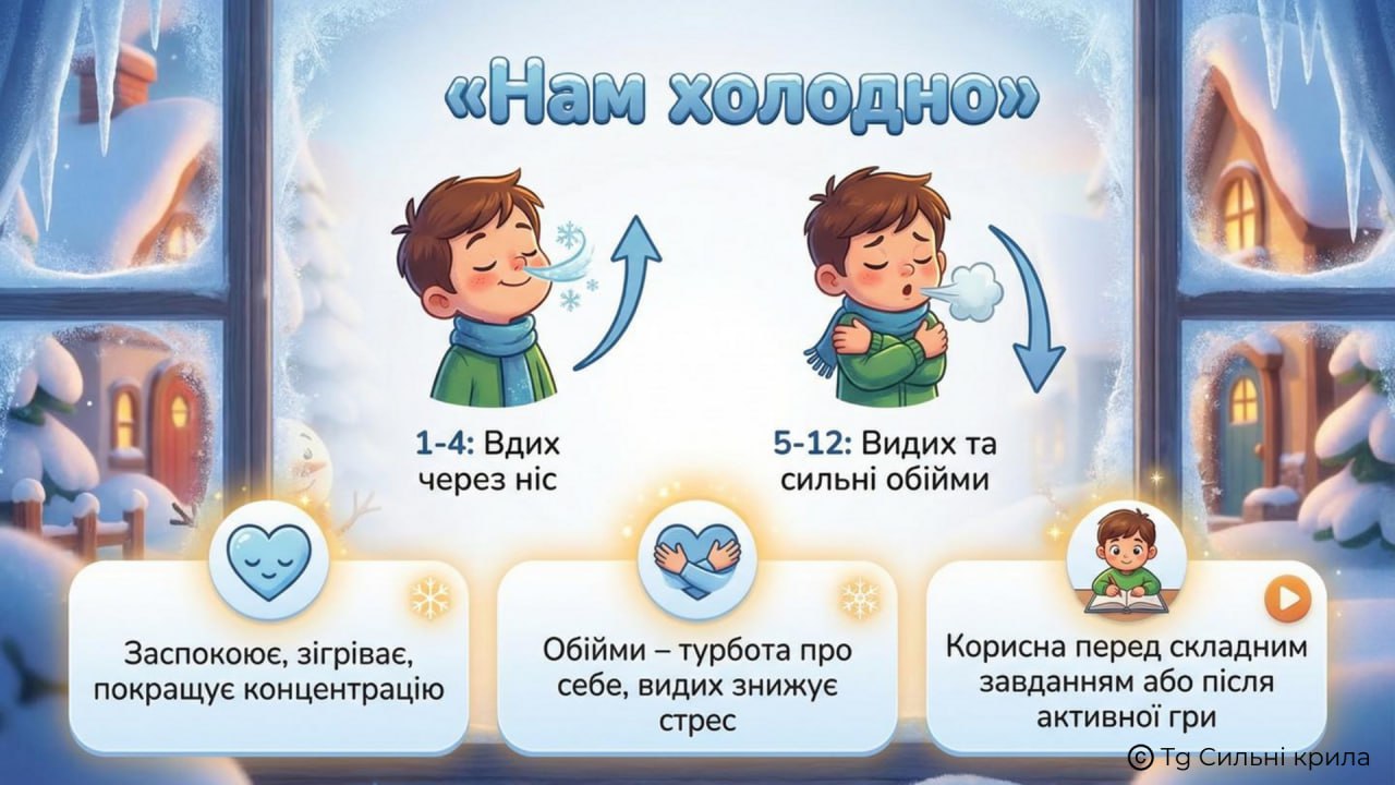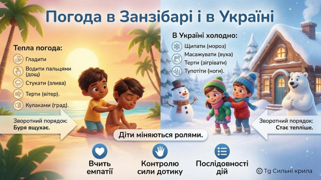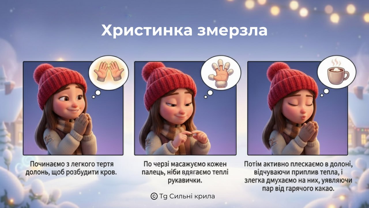 «А в Україні холодно. Коли виходиш на вулицю, мороз хапає за щоки (щипати за щоки), за вуха (масажувати вуха), пробирається під куртку (щипати спину), мерзнуть ноги (тупотіти ногами). Та коли заходиш у дім, стає тепліше, пощипують вуха, щоки (терти вуха, щоки). Поступово зігріваєшся, розслаблюєшся (гладити по плечах, спині)».