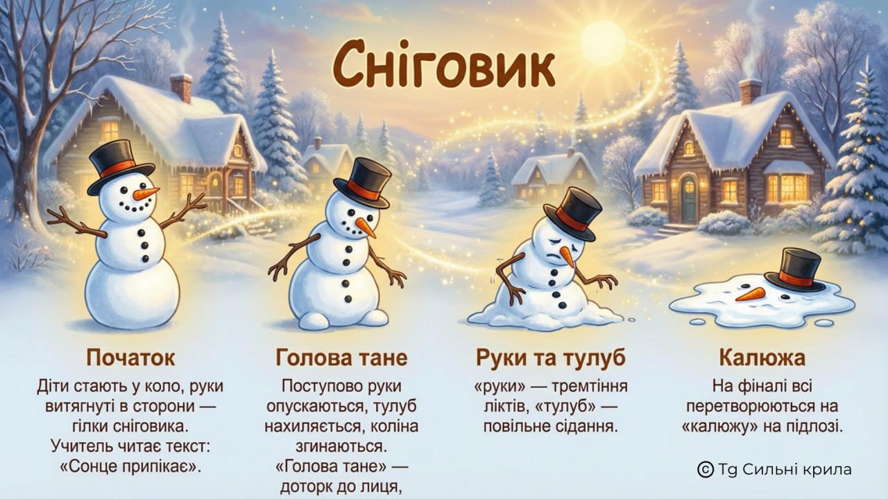 «Уявіть, що кожен з вас сніговик. Величезний, красивий, якого виліпили зі снігу. У вас є голова, тулуб, дві руки з гілочок, які стирчать в сторони, і ви стоїте на міцних ніжках. Чудовий ранок, світить сонце. Ось воно дужче припікає, і сніговик починає танути (зображають, як тане сніговик). Спочатку тане голова, потім одна рука, інша. Потім потроху починає танути і тулуб. Сніговик перетворюється на калюжу».